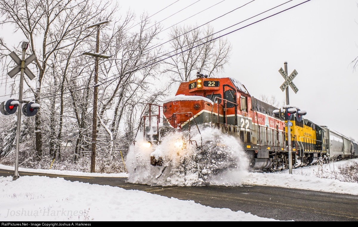 With two of the three road locomotives assigned to Canaan, Connecticut out of service for the time being, Housatonic Railroad Co. 22, an ex-Montreal Maine & Atlantic ex-Bangor & Aroostook nee-Santa Fe EMD GP7u, has been handling both it's normal yard duties around Canaan and is being used on the road train to Pittsfield. Accelerating out of a 10mph speed restriction, NX-13 kicks the snow bank at the Lime Kiln Road crossing in Great Barrington, Massachusetts, in command of HRRC 22 and HRRC GP35 3604 powering 22 cars bound for CSX at Pittsfield, Massachusetts.