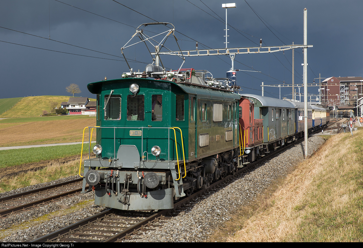 Former Bodensee-Toggenburg Bahn, now privately owned by Schorno Locomotive Management Gmbh and operated by DVZO, locomotive Be 4/4 # 11 is pulling a transfer run train from Etzwilen to Samstagern, via Ossingen-Winterthur-Effretikon-Wetzikon-Rapperswil-Pfäffikon SZ. Behind the locomotive is tractor Tem III # 354 of DVZO, followed by privately owned passenger cars, which are going to the revision in the Samstagern workshop. About half an hour after the shot, the snow storm was there....