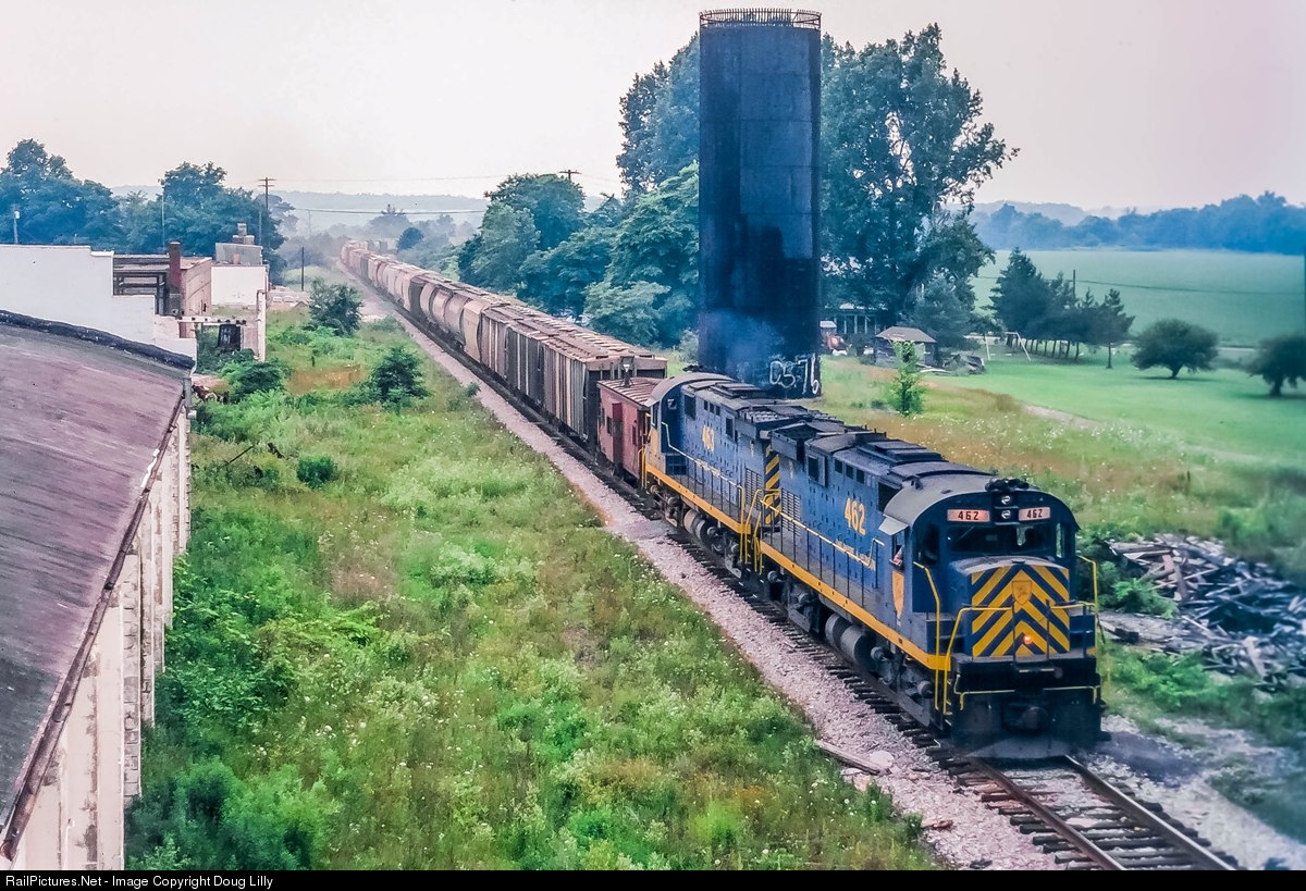 | he two C424m’s that served as as helpers from Hornell are now leading the Delaware & Hudson salt train over the Genesee & Wyoming at Griegsville, New York. NOTE: My slide is labeled as being at Griegsville, but I can’t find anything that redembles this scene on Google maps. Pleae let me know if this is another location. |