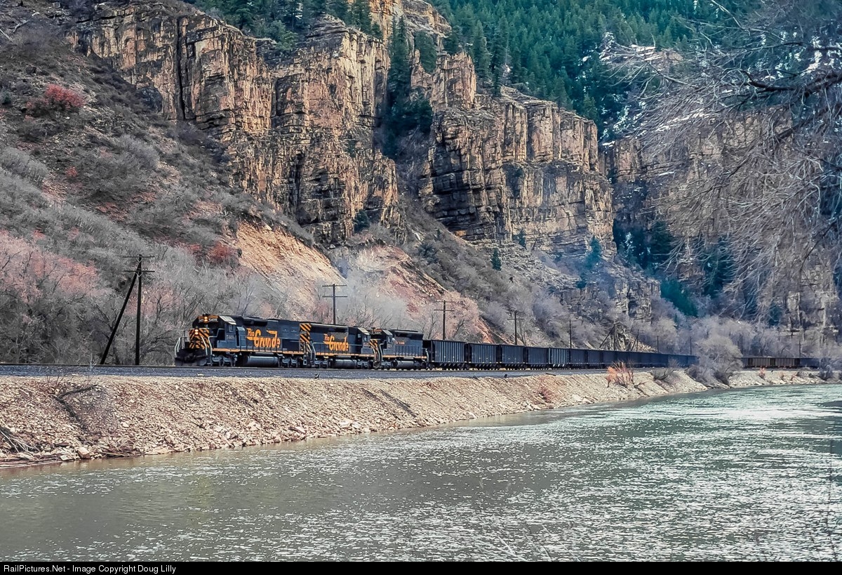 A Rio Grande tunnel motor and a pair of SD45’s bring eastbound coal through Glenwood Canyon near Allen, Colorado.