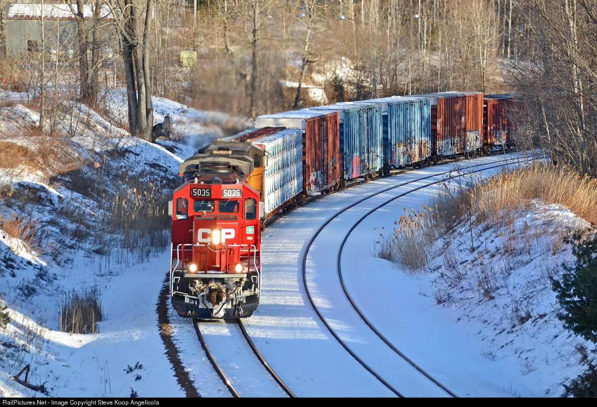The sun is just coming over the trees on a frigid Adirondack morning as Canadian Pacific train 252 is passing through the Rockland siding with the CP 5035 leading and UP 5534 second.