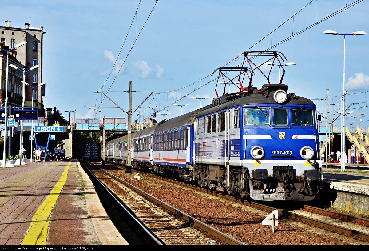 | EP07-1017 with train TLK84200 "Pogoria" from Szczecin Główny to Bielsko Biała is starting from the beginning station from track 6 next to platform 3. |