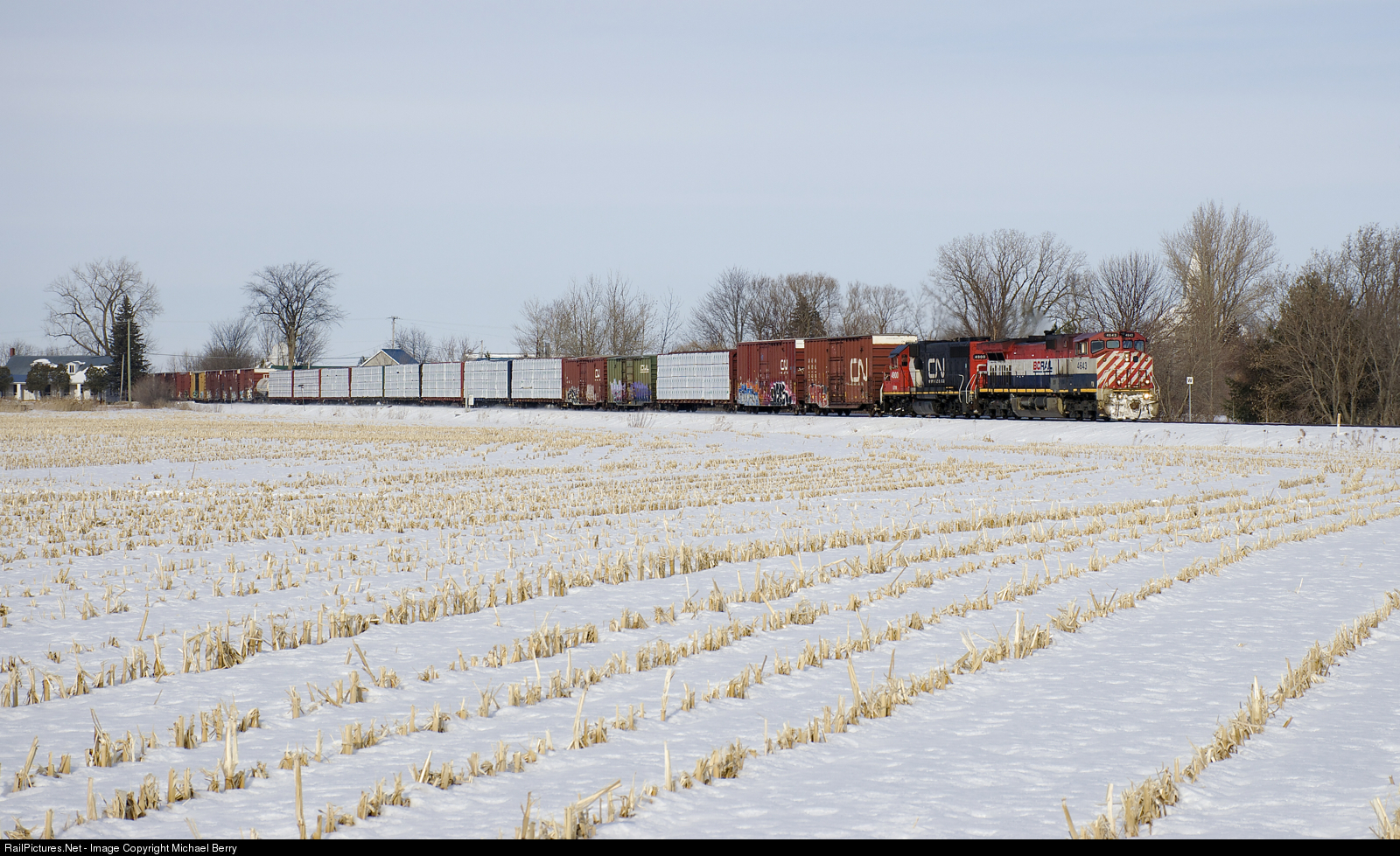 En route to the Canada-U.S. border and then interchange with the NECR in St. Albans, Vermont, CN 324 passes a cornfield in the small town of Saint-Blaise-sur-Richelieu with BCOL 4643, GTW 4900 and 54 cars.
