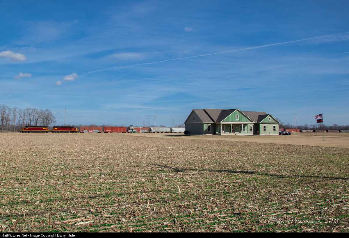 | After making a pickup of cars near Dover, DE, Delmarva Central road local HA-1 is nearing the end of its northbound journey to Clayton, DE where it will interchange with Norfolk Southern local K64 about a mile north of this location. The train is seen passing one of the many line-side farms. this one with Old Glory proudly flying in the front yard. |