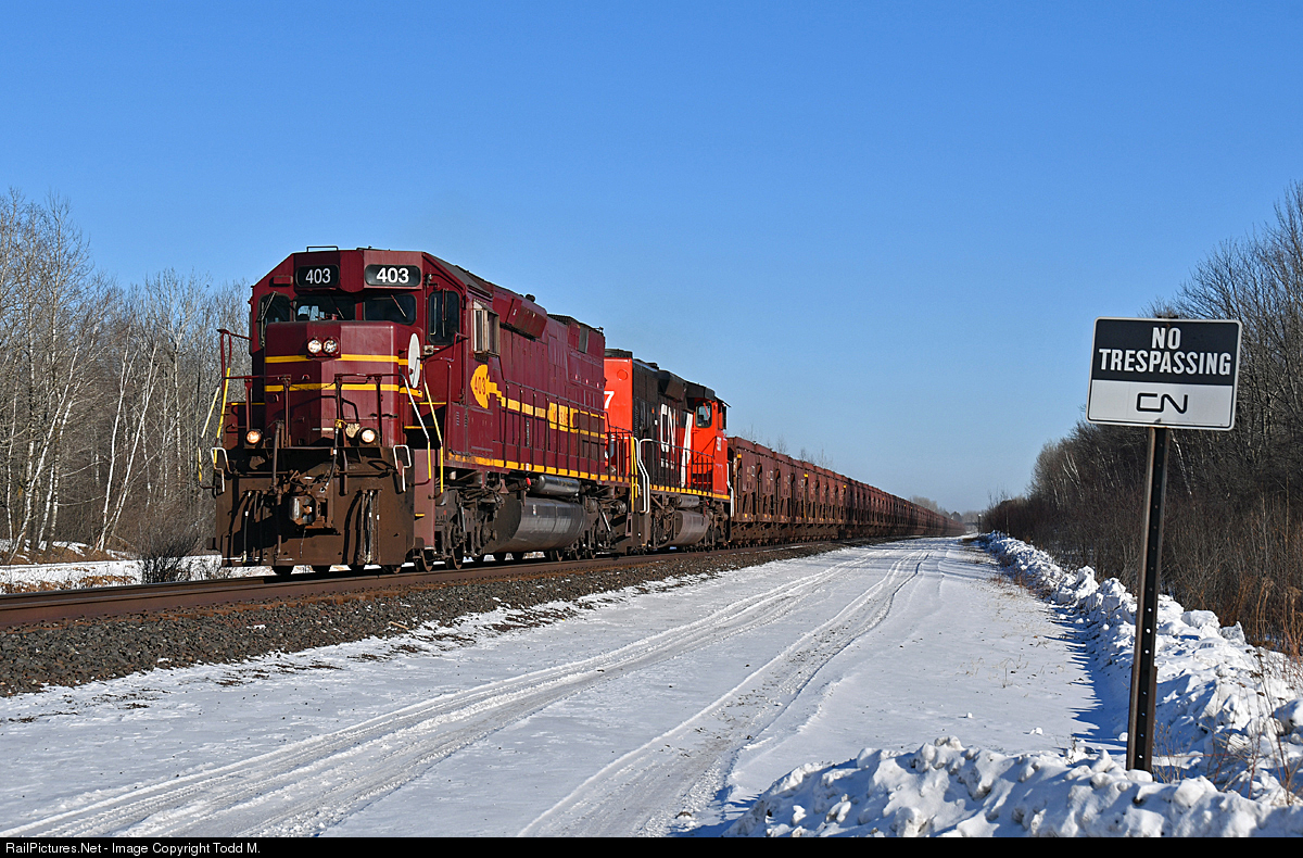 | Shortly after leaving the yard at Proctor, DMIR 403 races north at track speed up the Missabe Sub. with a string of ore behind them heading to United Taconite to load. |