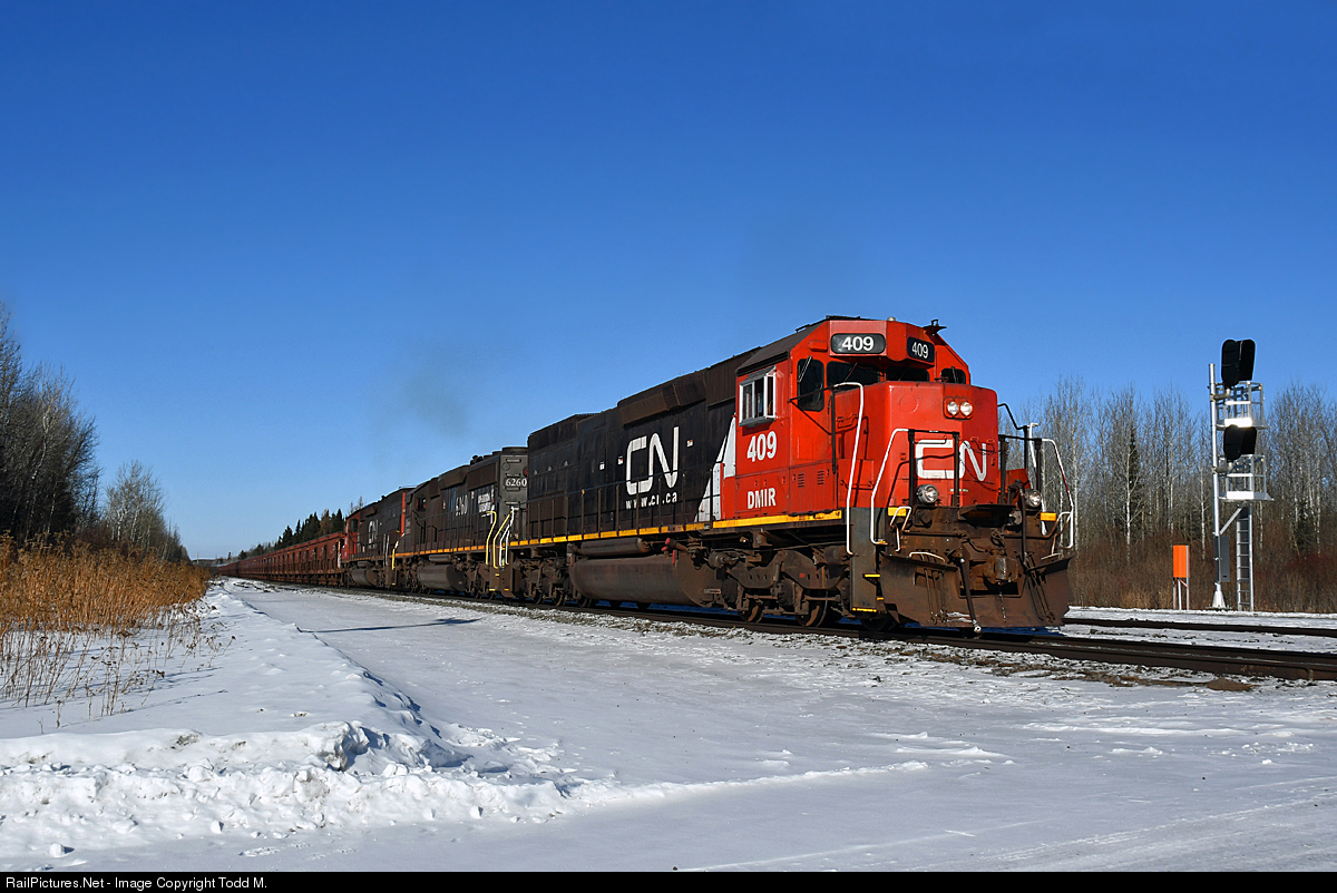 | DMIR 409 rumbles south on the CN Missabe Sub after departing U.S. Steel Minntac. They will encounter several northbound CN freights along their way back home to Proctor, MN and the yard. |