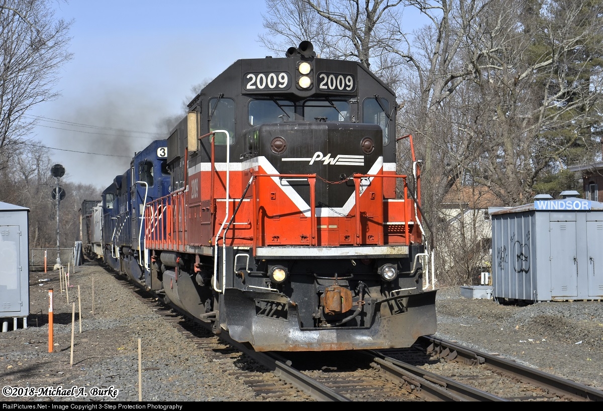| A rare Saturday run of EDPL (East Deerfield - Plainville), lead by leased Providence & Worcester GP38-2 2009, passes Windsor interlocking on a sunny afternoon in February. |