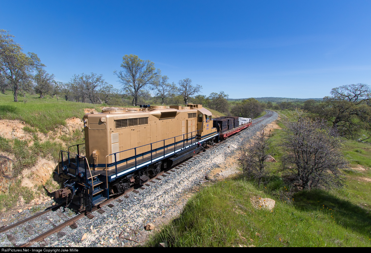 Gold Country. With a fresh coat of gold paint, SERA #48 guides a special work train through the beautiful foothills of the Sierra Nevada Mountains. This train is headed towards a brand new 3,800' siding being installed by the Sierra Railway, just east of Cooperstown. Farther up the hill, the Fassler Flyer is busy serving the industries of Sonora, making for a very unusual two train day along the historic Oakdale Branch.