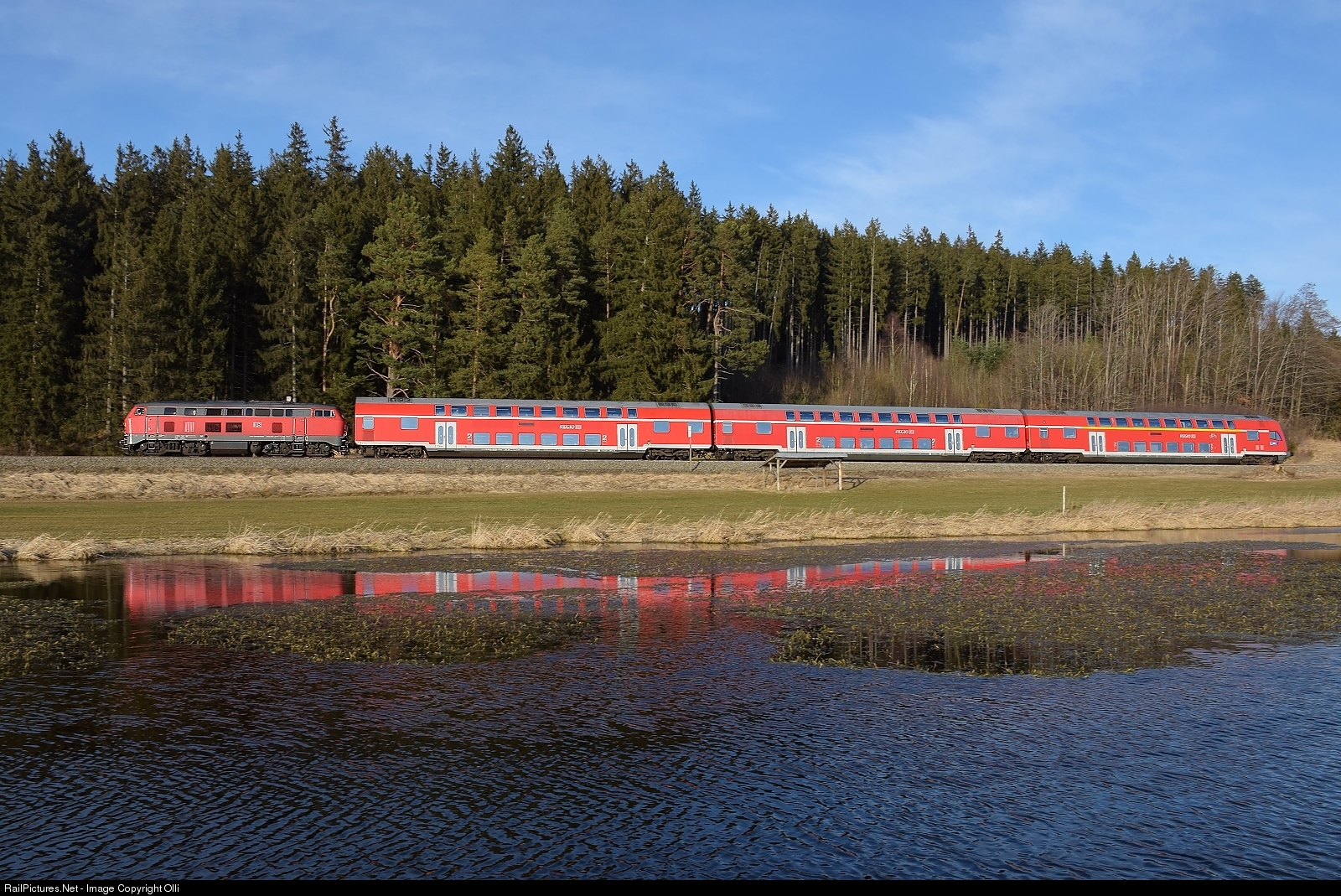 Not too many locomotives of the once common german class 218 Diesels are still active. 218 passed the basin of the little Ruderatshofen power plant with a few double deck cars at full speed.