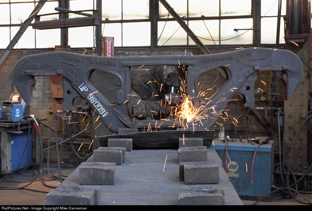 On September 28, 2011, inside Union Pacific’s De Soto, Missouri, car shop a welder grinds a repair to a freight car truck side frame that once belonged to UP covered hopper No. 980091. The repaired side frame will join the parts supply and eventually be used under another similar freight car cycling through the shops during a rebuild.