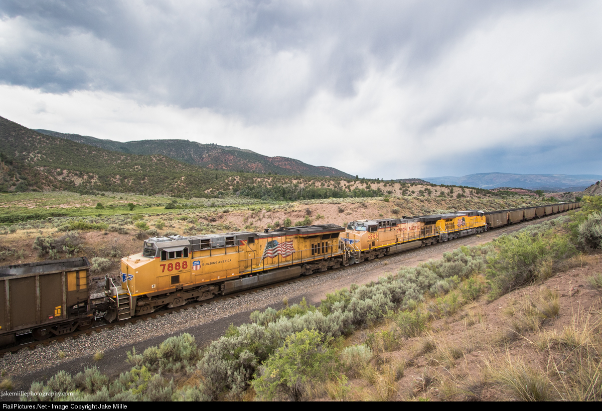 Big mountains, big trains, big power. Moving heavy trains through the Rocky Mountains is no easy task. 100+ car coal trains often utilize mid train DPUs (Distributed Power Units), such as this eastbound coal train at Bond, Colorado. The skies have filled with ominous cloud cover, foreshadowing the heavy thunderstorm activity predicted for the early afternoon.
