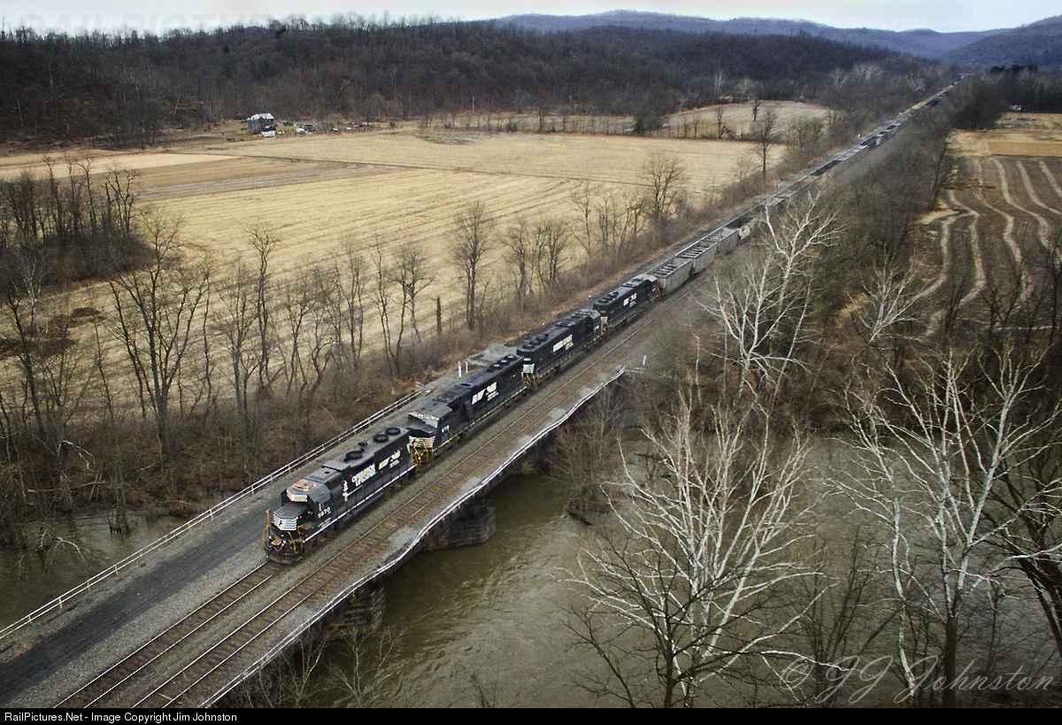 | NS 5670, GP38-2 in Operation Lifesaver scheme, leads an empty coal drag with NS 6718, 6736 and 6717 in tow over the Little Juniata River. |