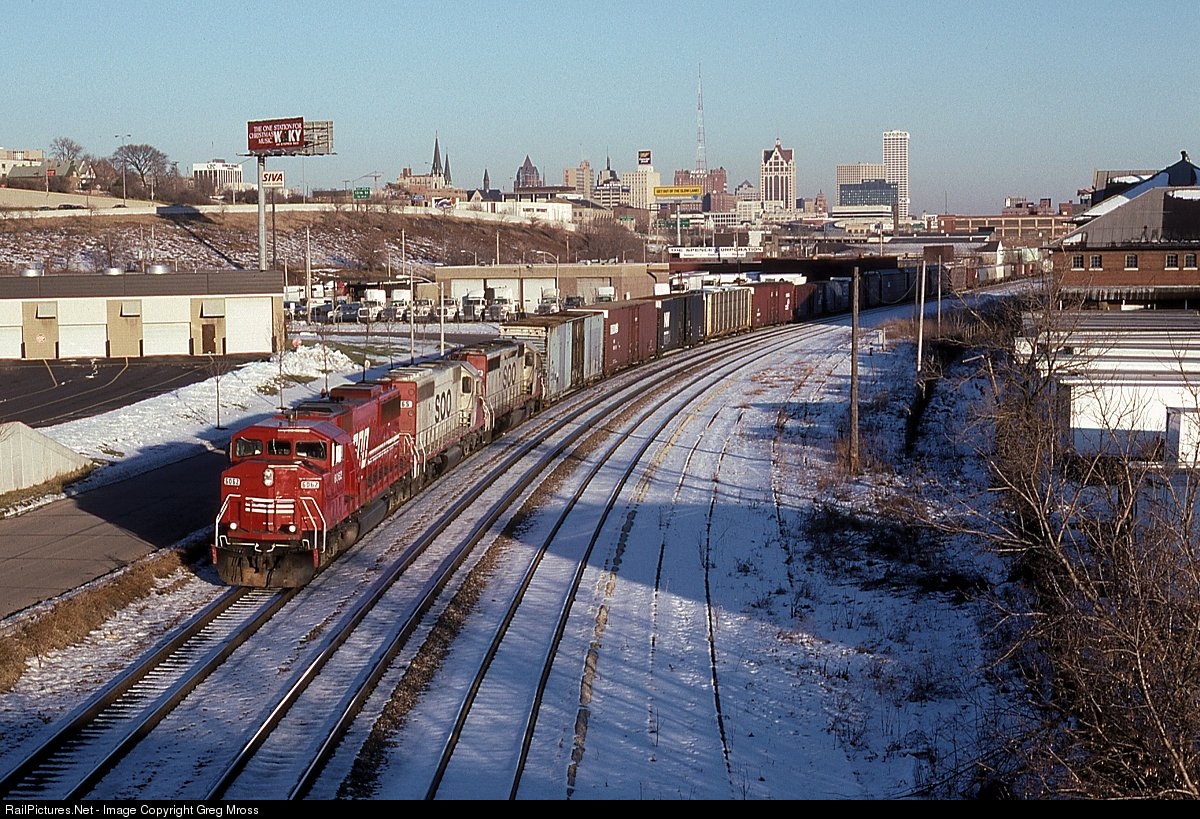 The Soo Line only had 5 widecab SD60M's and the last one, 6062, leads a train out of Milwaukee, WI in January of 1991. The billboard on the left is for radio station WOKY, a longtime station that brought the Beatles to Milwaukee for their only appearance here.