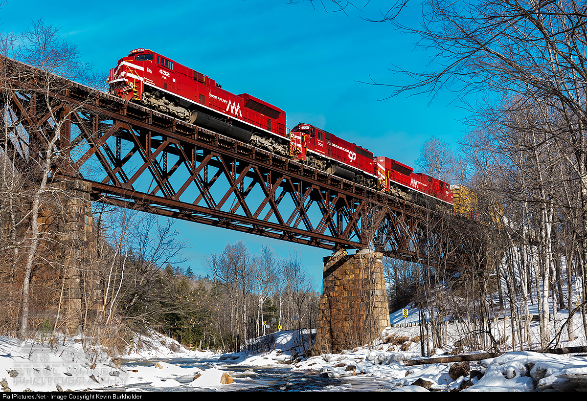 Vermont Rail System, for only the second time in a year (and by design) operated an all-red consist that is book-ended by the railproad’s pair of SD70M-2s. Due to bridge restrictions and weight distribution directives, the pair can no longer run back-to-back without a 4-axle loco in between and an empty car on the head pin. The Saturday slurry train was led by VTR SD70M-2s 432 and 431, with CLP GP40-2 306 in the middle. The 263 is crossing the Mill River in Cuttingsville, VT.