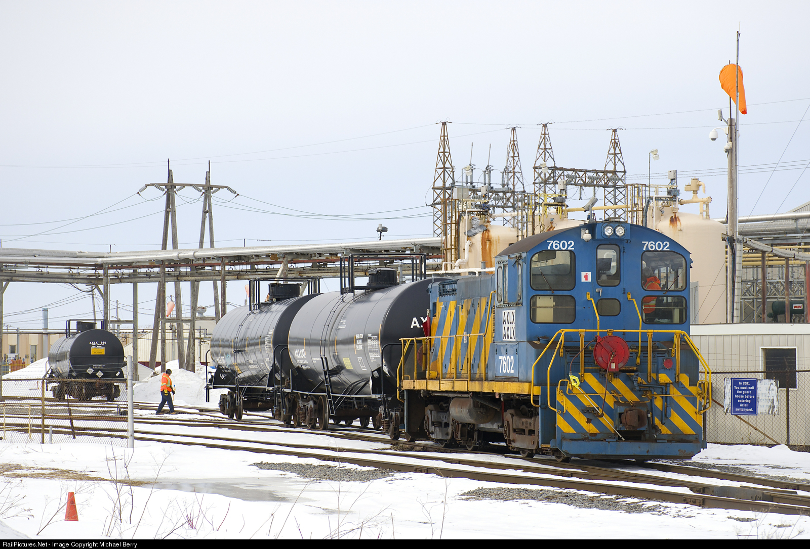 | Still wearing Port of Montreal colours. AXLX 7602 does some switching at the Axiall Canada Inc. plant (formerly PPG Standard Chemical) as it moves a couple of tank cars with the same reporting mark as the engine. AXLX 7602 is an SW1001 that was built for the Port of Montreal and still wears those colours. |