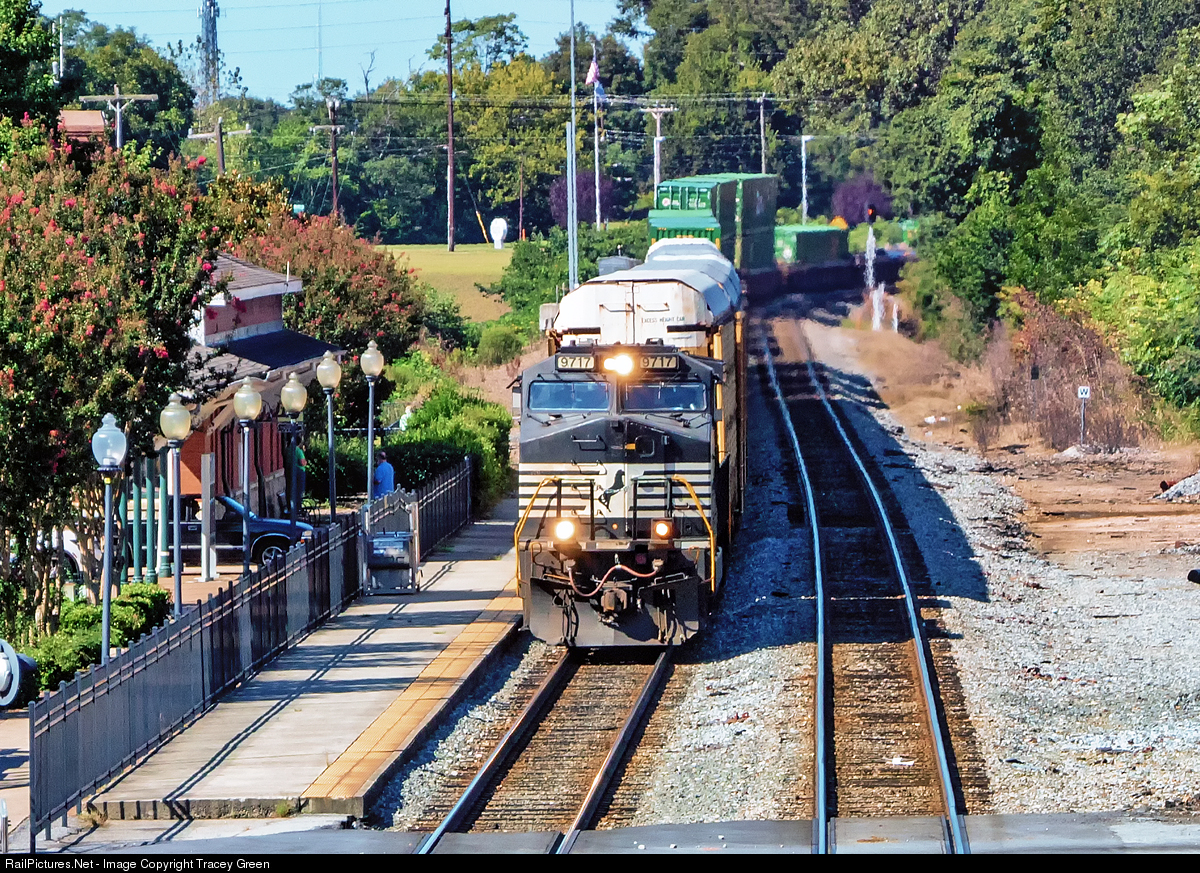 | Late Freight! After being delayed by an unrelated incident involving Amtrak 19, this intermodal closely follows the hotshot NS 204 through Spartanburg on its way north. Lots of people are enjoying watching trains at the Spartanburg Depot in this beautiful day. |