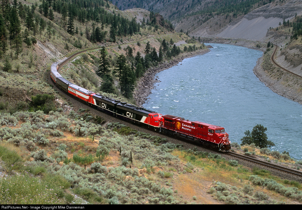 Traveling eastbound through the Thompson River Canyon west of Drynoch, British Columbia, is a Canadian National passenger train on July 5, 2004. The train is on Canadian Pacific rails, and is piloted by new CP AC4400CW No. 9807, with CN’s brightly-painted E9A Nos. 102 and 103 trailing the big GE on the five-car train. This part of the canyon sees both railroads performing directional running between Mission and Basque, with CN handling the westbounds and CP running the eastbounds.