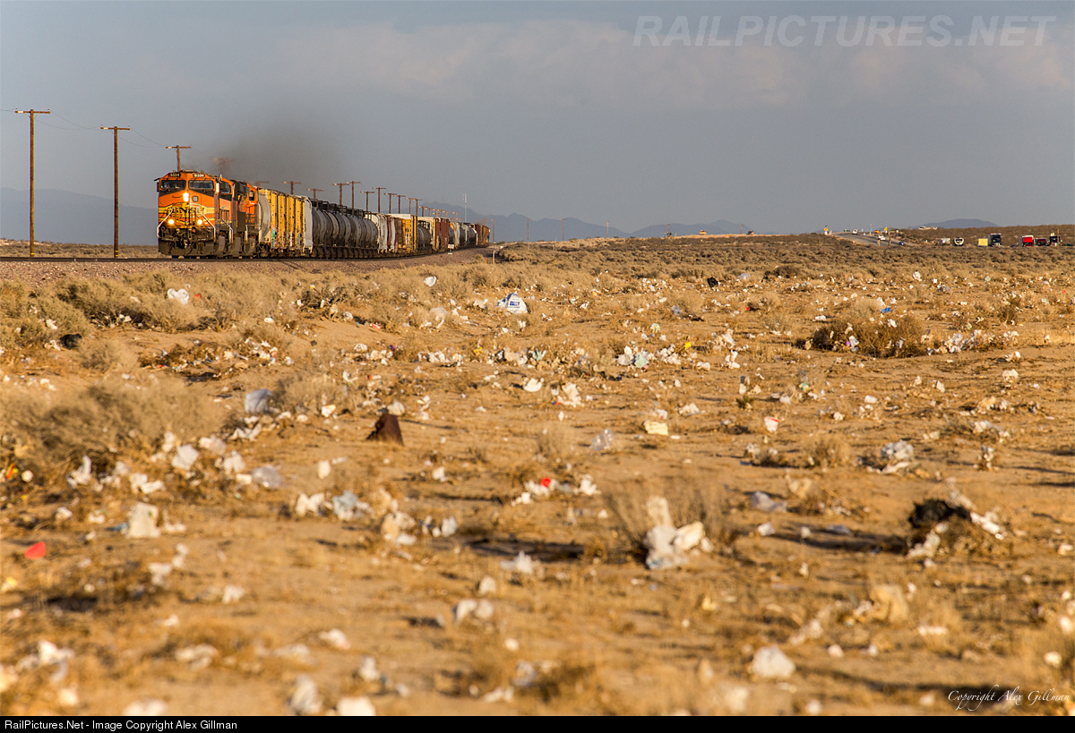 | While the Mojave Desert offers a wide range of breathtaking photography vantages...those closer to civilization have unfortunately been tainted with. One of these scenes can be found near the town of Kramer Junction in the form of thousands of pieces of trash that have been blown from the local businesses here into the small shrubs between Highway 58 and BNSF's Mojave Subdivision. Today is no different than any other day here as the BNSF 5334 is seen in the background hustling a westbound manifest toward Mojave where it will make the turn north for a trip over Tehachapi. |