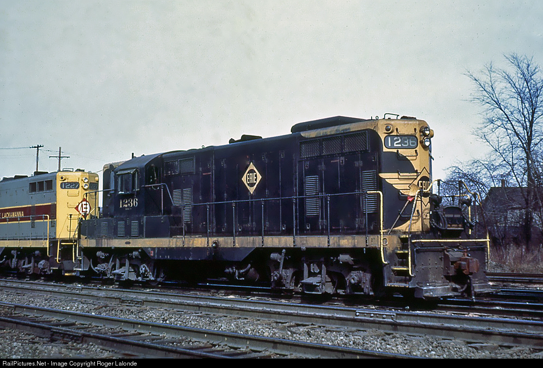 | Erie Railroad GP7 1236, and sister unit 1227 painted in Erie-Lackawanna colors. Unknown photographer, slide from my collection. |