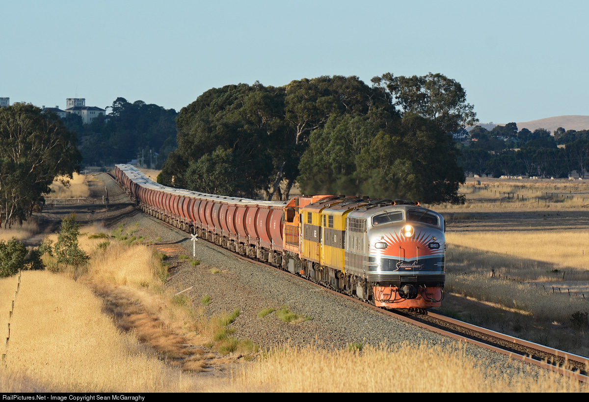 | A group of old timers are called in for duty to work SSR's Emerald grain train from Dimboola to Appleton Dock. B61, GM10, GM22 & L277 combine to work 7934V just south of Ararat with the sun bursting through a small gap in the clouds to light up the scene spectacularly. |