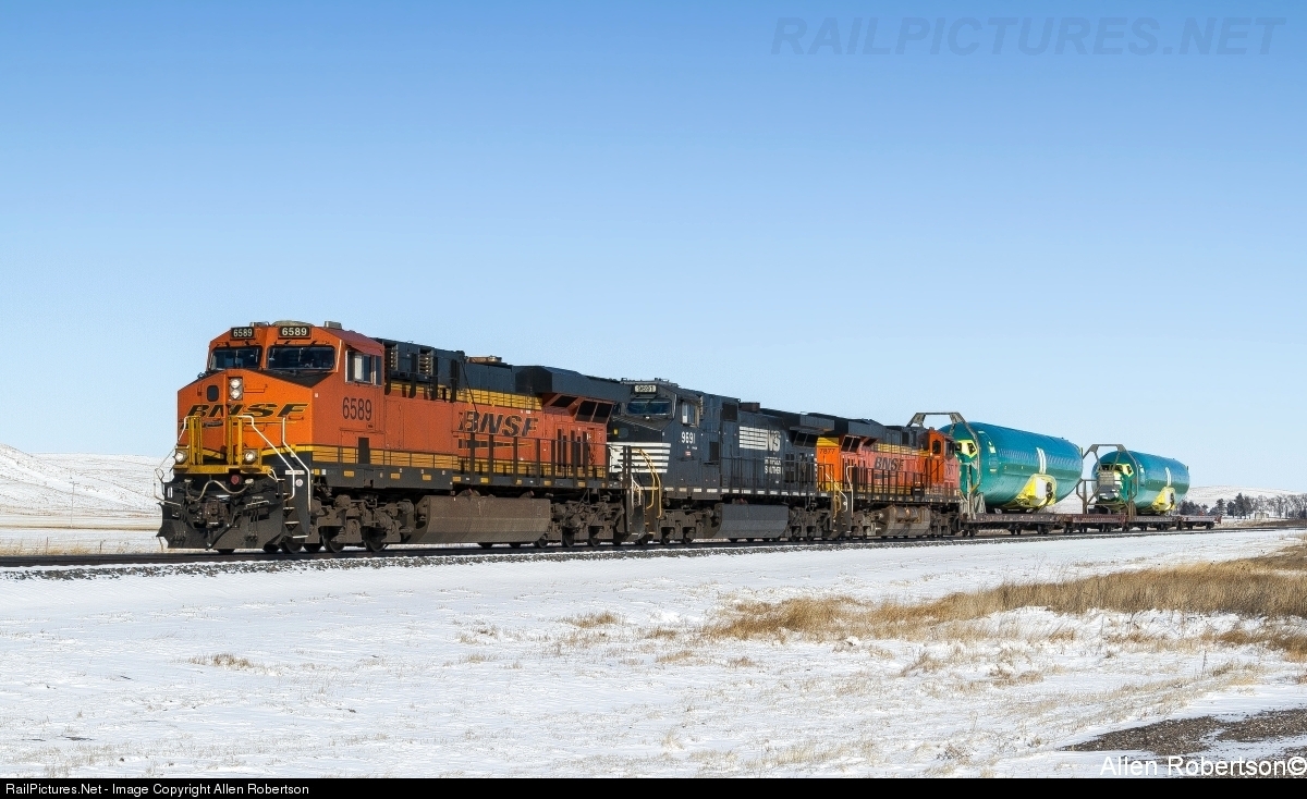 | BNSF 6589, NS 9691, & BNSF 7877 lead two Boeing fuselages westbound. |