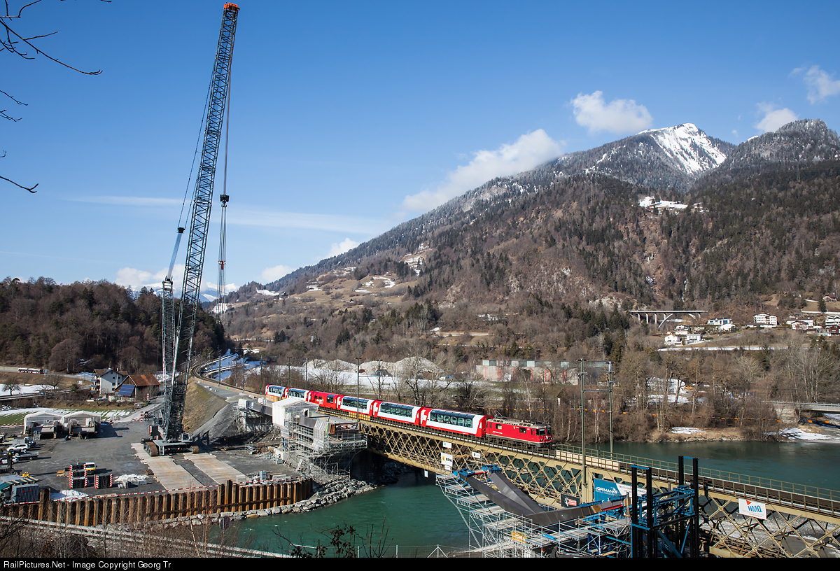 Construction site for the new Hinterrhein bridge at Reichenau-Tamins, with a huge Lieberherr crawler crane of Fanger company and the small GLACIER EXPRESS train GEX 903 from St.Moritz to Zermatt via Chur, pulled by Ge 4/4 II # 614 "Schiers". Parallel to the old truss bridge from 1895, a new 200 meter long steel bridge is beeing built for a second track. The crane serves, during several weeks, for placing the bridge elements, which are welded together left of the crane. There are about 1200 ton steel used for the new bridge and 2000 m3 concrete.