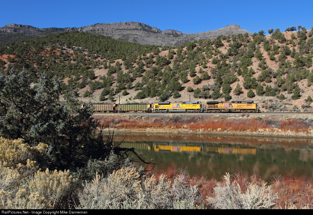 | Locomotives leading an eastbound Union Pacific coal train softly reflect on the Colorado River as it departs Yarmony, Colorado, on November 7, 2012. |