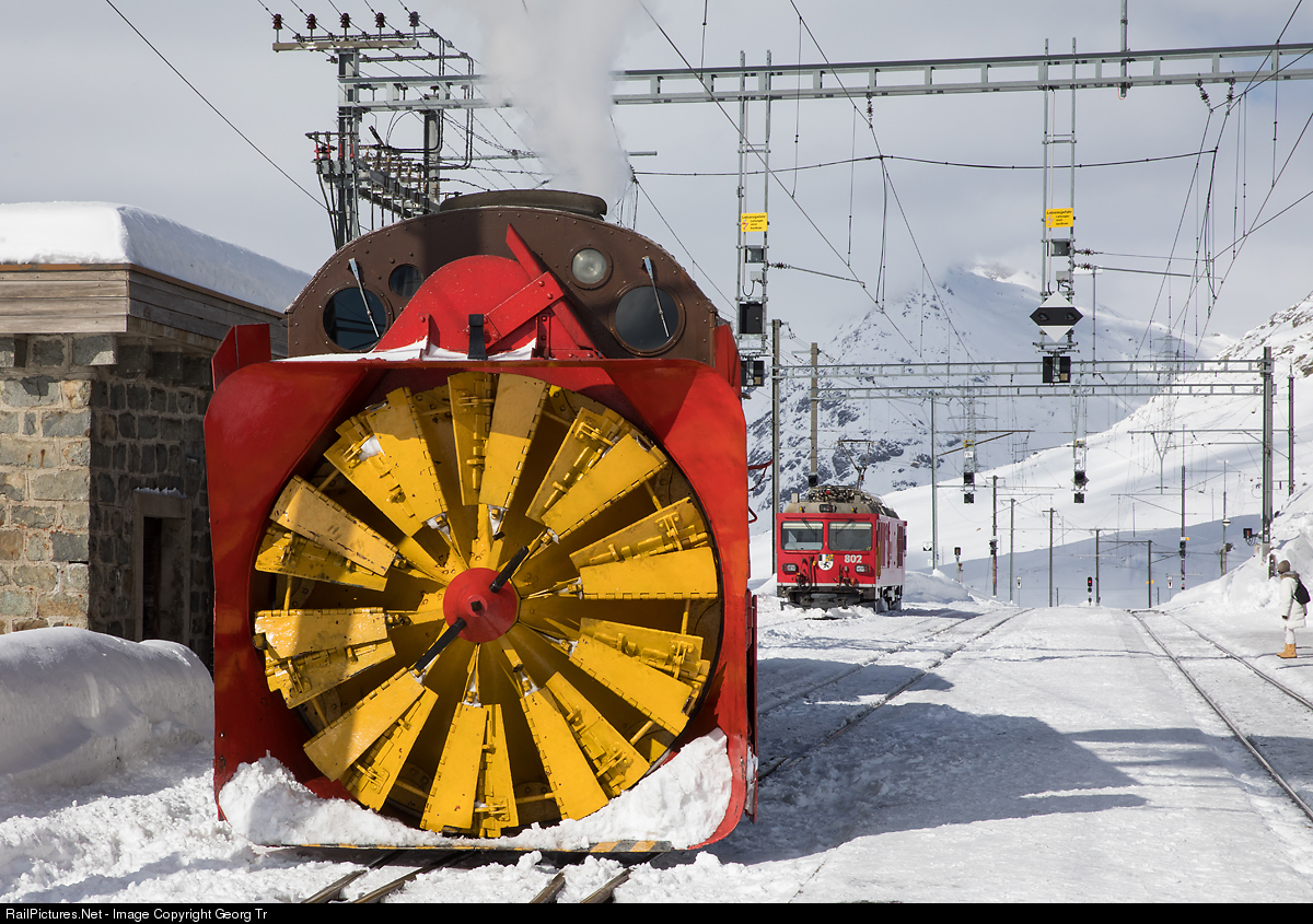 | The crew is having lunch in the station restaurant and the steam rotary snow blower Xrot d # 9213 is parked in front of the building. In the background dual power locomotive Gem 4/4 # 802 "Marmot", built in 1968. |
