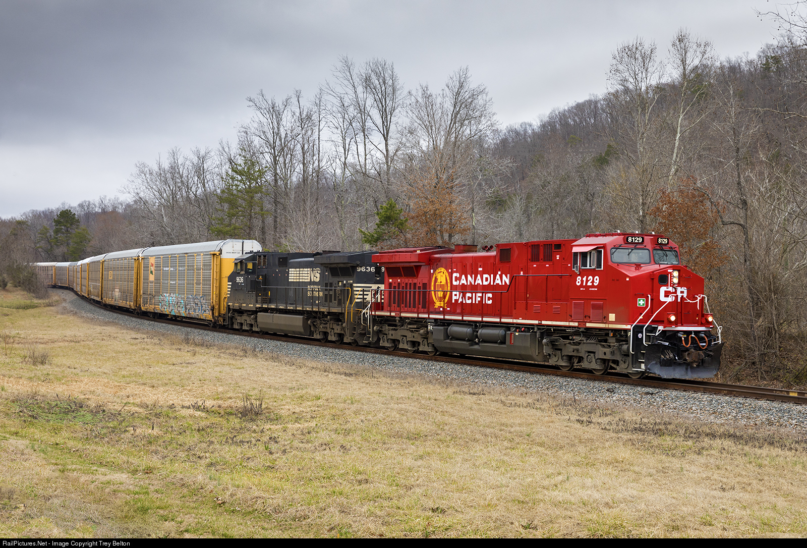 Freshly rebuilt CP 8129 leads daily NS 272 autorack train south through Mayodan on a dark and dreary morning.