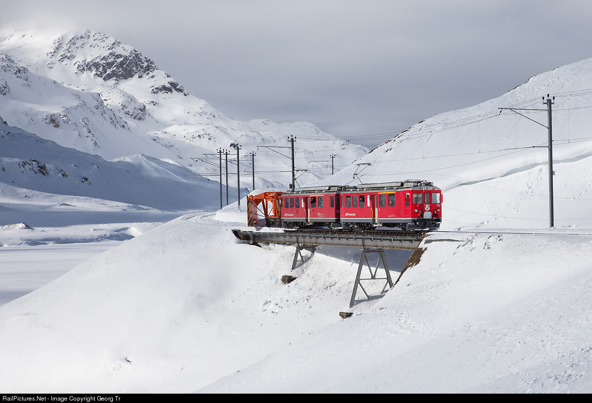 | Railcars ABe 4/4 # 47 and # 46 with the snow scrapper Xk # 9132 on the wild west bridge south of Ospizio Bernina. The blades of the snow scrapper are widened to 6 meter, pulling snow from both sides into the middle of the track. |