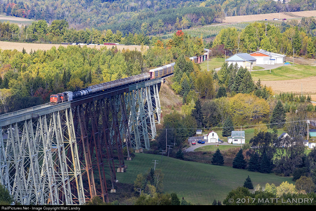 A CN eastbound X474 starts it's trek across the massive 3,920 foot Salmon River Trestle at New Denmark, New Brunswick.