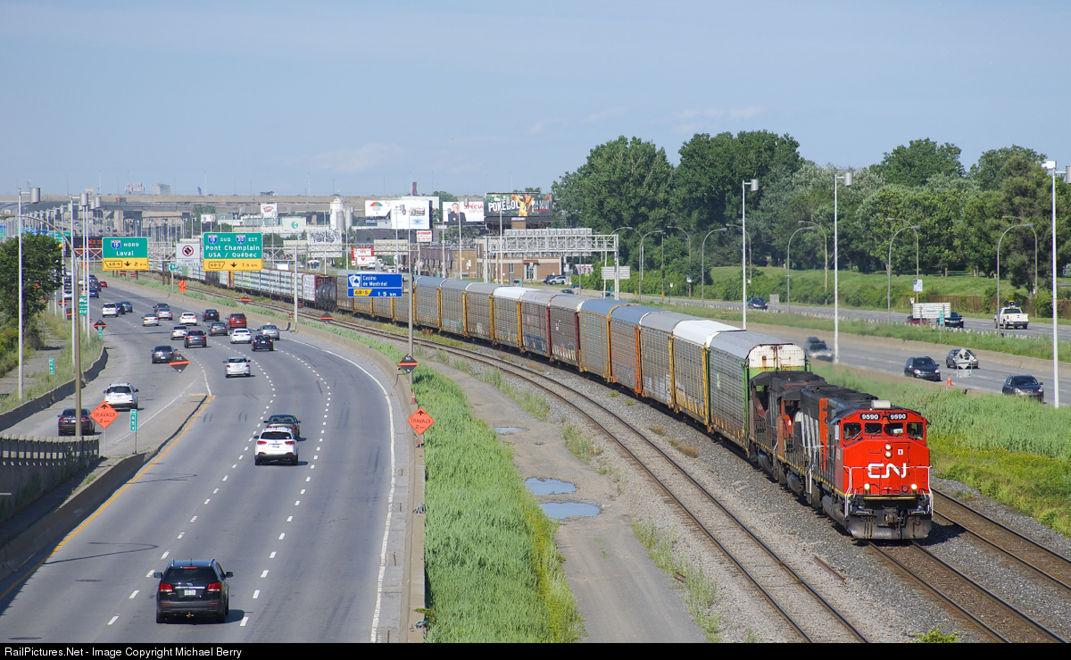 | CN 401 with GP40-2L(W)'s CN 9590 & CN 9675 and GP38-2W CN 4806 for power splits autoroute 20, with 72 cars in tow. Since this picture was taken the westbound lanes at right have been removed and moved further north and the same will happen to the CN tracks here by the end of 2018. |