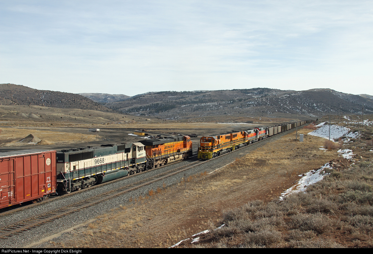 | Utah Ry. 6060 west is bringing an empty coal train over Soldier Summit and in the process is overtaking a BNSF trackage rights manifest train stopped on track #1. The BNSF train followed the Utah Ry. train westbound down the pass. Those 2 BNSF engines are the DPU helpers. There are a couple of unusual things about this shot. First are all of those westbound empty coal hoppers. I assume they were pulled out of storage somewhere around Helper and are moving west to “who knows where.” Second is that UTAH SD50 leading the empties. This is only the second time I have seen one of these Aussie SD50’s leading. A rare occurrence, but not unheard of as I have a shot of this same #6060 leading an empty oil train in August 2010. |