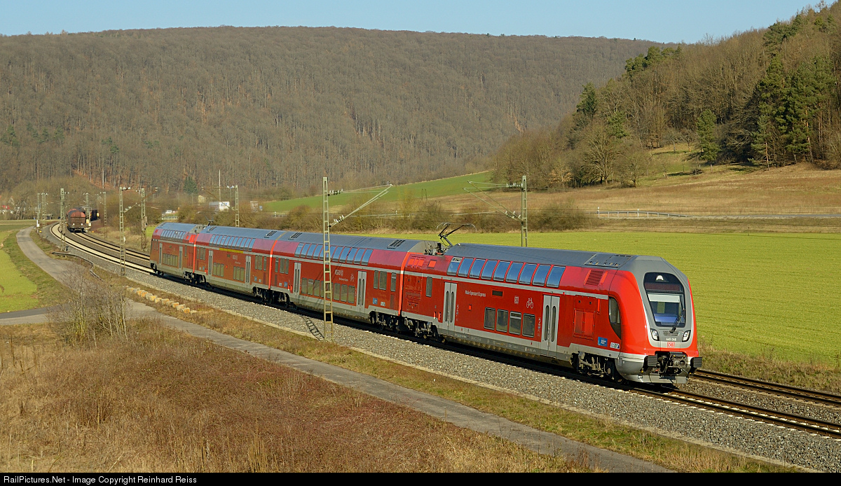 | New concept for bi-level regional trains: Two power cars (class 445) and two (or more) center coaches allow various trainsets. 445 046 and 060 are on the way to Bamberg, just passing Wernfeld area. |