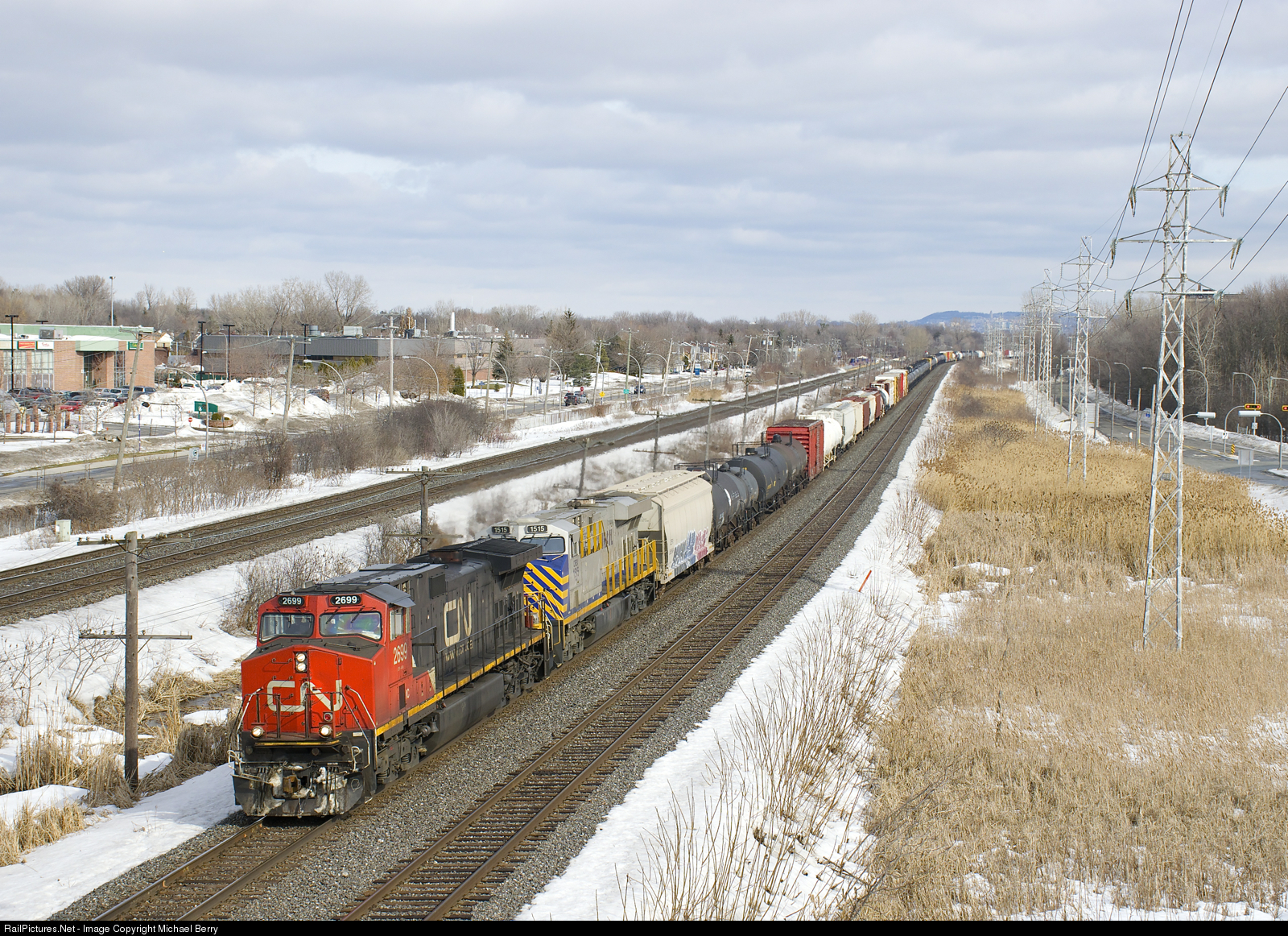 CN 369 had a minor derailment on the Joliette Sub last night, putting a very late CN 369 out of Taschereau a bit past noon. Here it's about to pass MP 14 of the Kingston Sub with IC 2699 & CREX 1515 for power.