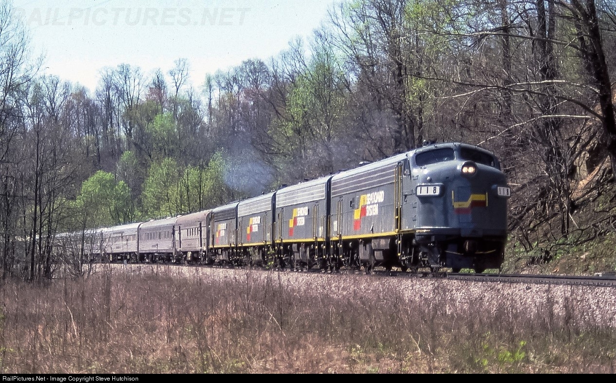 A matched set of F7, A-B-B-A, lead by Seaboard System 118(former Clinchfield 200)descends the famous Clinchfield Loops with an excursion train bound for Spartanburg, SC.