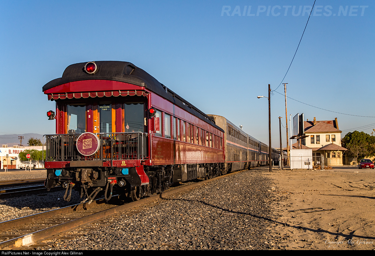 The beautiful private car Cyrus K. Holiday cools its heels on the rear of the detouring southbound Coast Starlight as it changes crews at the original Southern Pacific depot in Bakersfield prior to taking on the grades of Tehachapi.