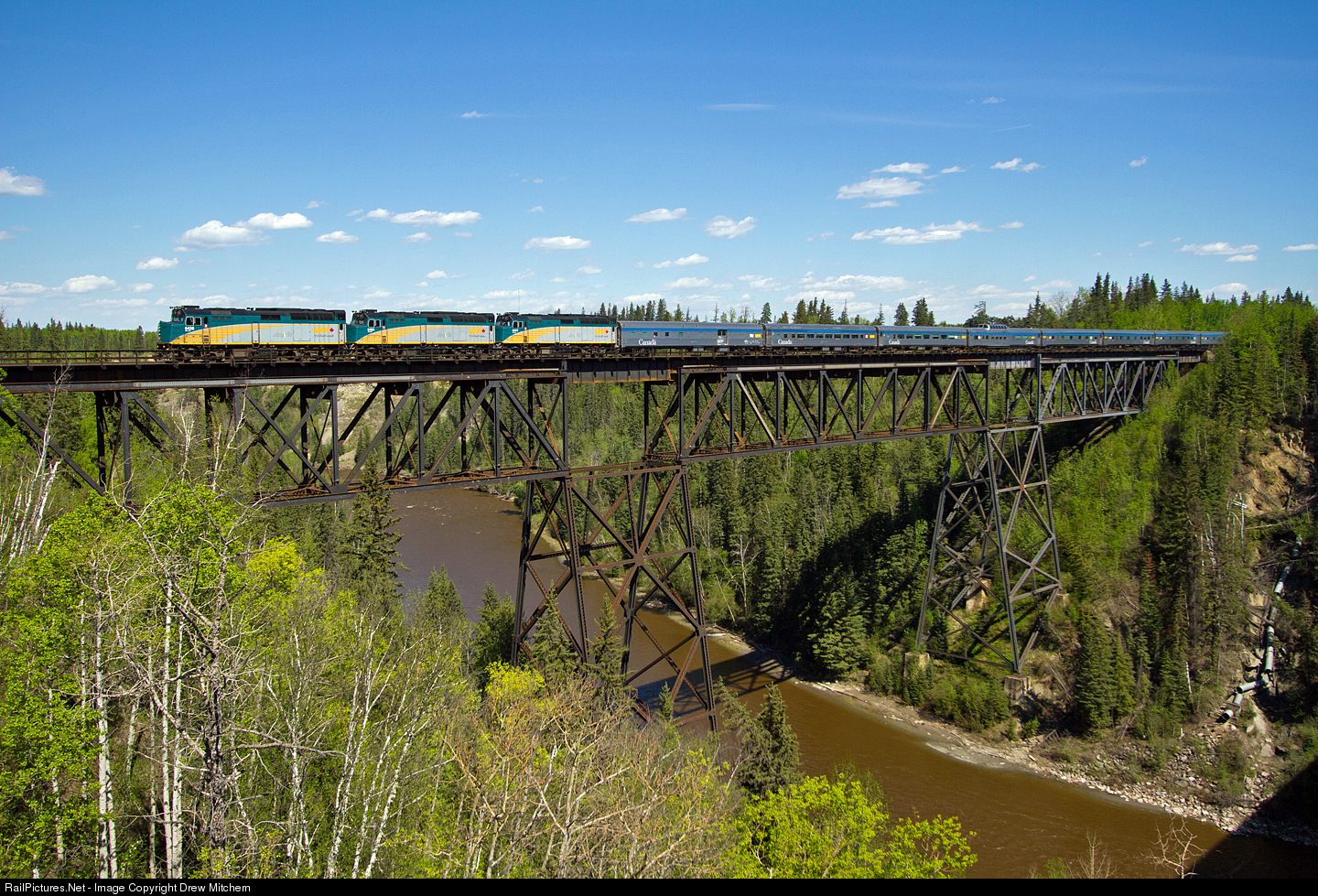 Via train #1, the Canadian, passes over the Pembina River Gorge between Evansburg, AB and Entwistle, AB on 5/21/17. This shot was pretty gutsy to take, straddling the guardrail of westbound Canada Hwy 16 bridge adjacent to the railroad trestle.