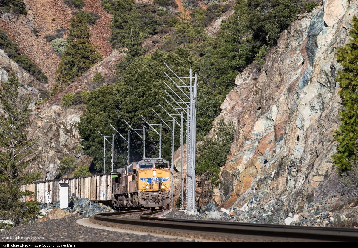 | Railroading out here isn't easy. The Feather River Route cuts through some of the most treacherous terrain in the Western United States. The tracks often parallel huge walls of loose rock, creating the potential for rock slides at any time. The railroad has resorted to slide fences in some places. If a rock slide does occur, the fence will be "tripped" and the near by signals will display a stop indication. This system helps prevent trains from encountering rock slides without warning. Union Pacific 7477 guides a heavy coal train passed the slide fencing at Rich Bar, California. |