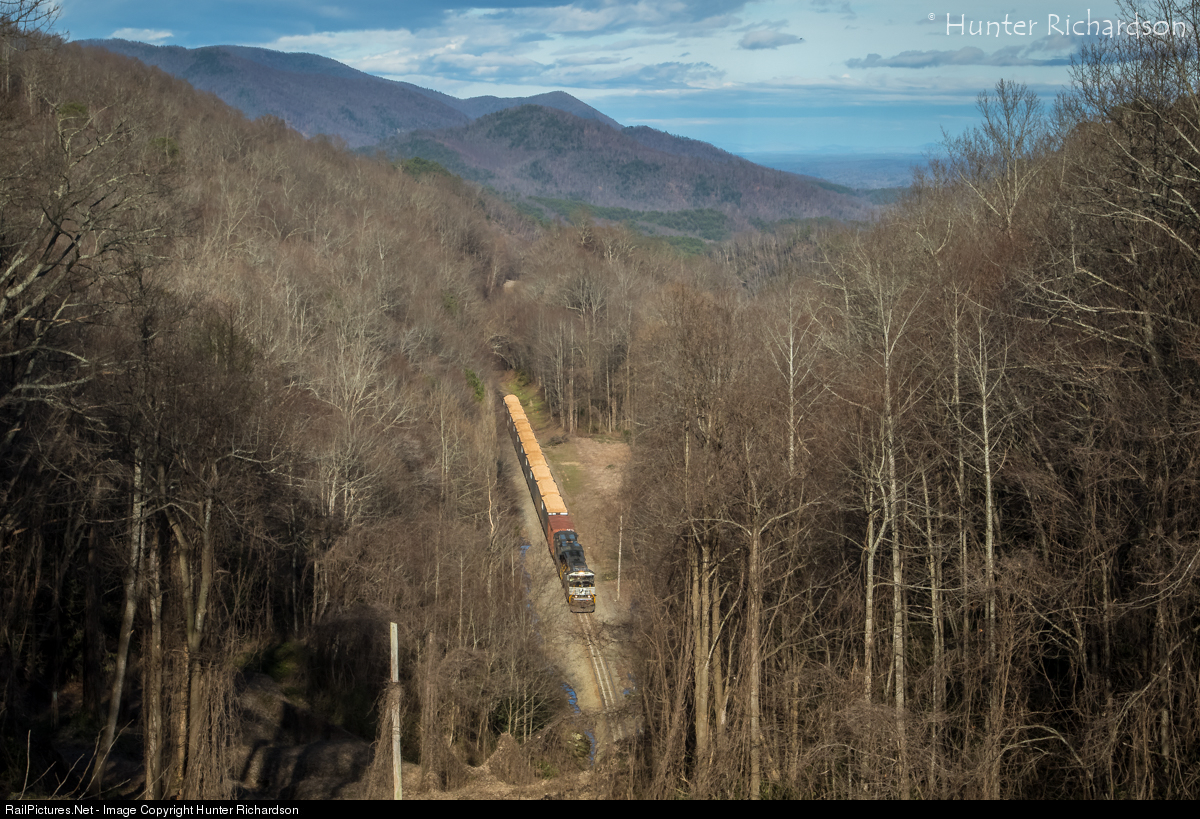 | Approaching the east portal of Swannanoa Tunnel, Asheville Local P87 climbs up the famed "Old Fort Loops" with woodchips from Bridgewater billed to Evergreen and the BLU. |