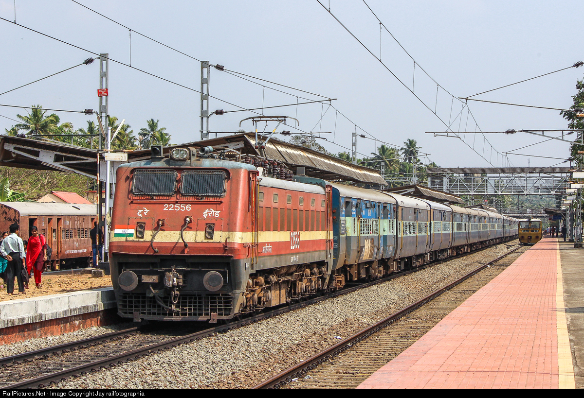 Kanyakumari - KSR Bengaluru Express arriving at Paravur station as a track utility vehicle waits for signal in the other line