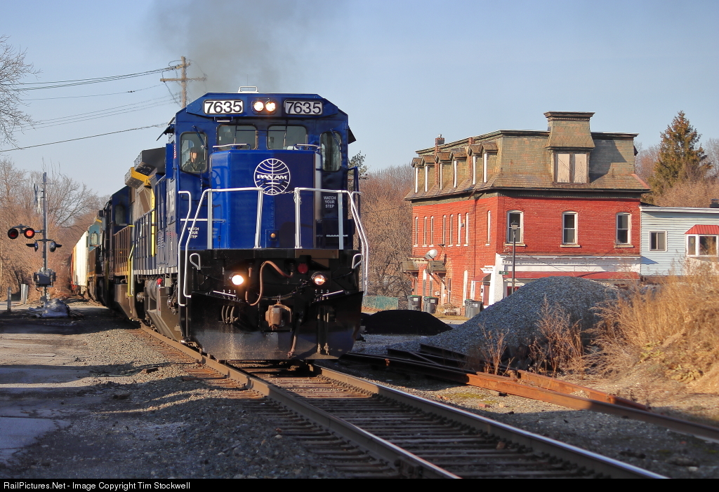 MAIDEN VOYAGE: For the first time since being repainted from its former CSX colors into Pan Am's paint scheme, MEC C40-8 #7635 leads a train on Pan Am Southern's "West End"--in this case Train RJED (Rotterdam Junction, NY to East Deerfield, MA). Here, the engine leads the train through Hoosick Falls, NY, with its fresh coat of blue paint nicely complimenting the brick buildings in town. This also marked the first time that ANY repainted MEC C40-8 led a train on the "West End."