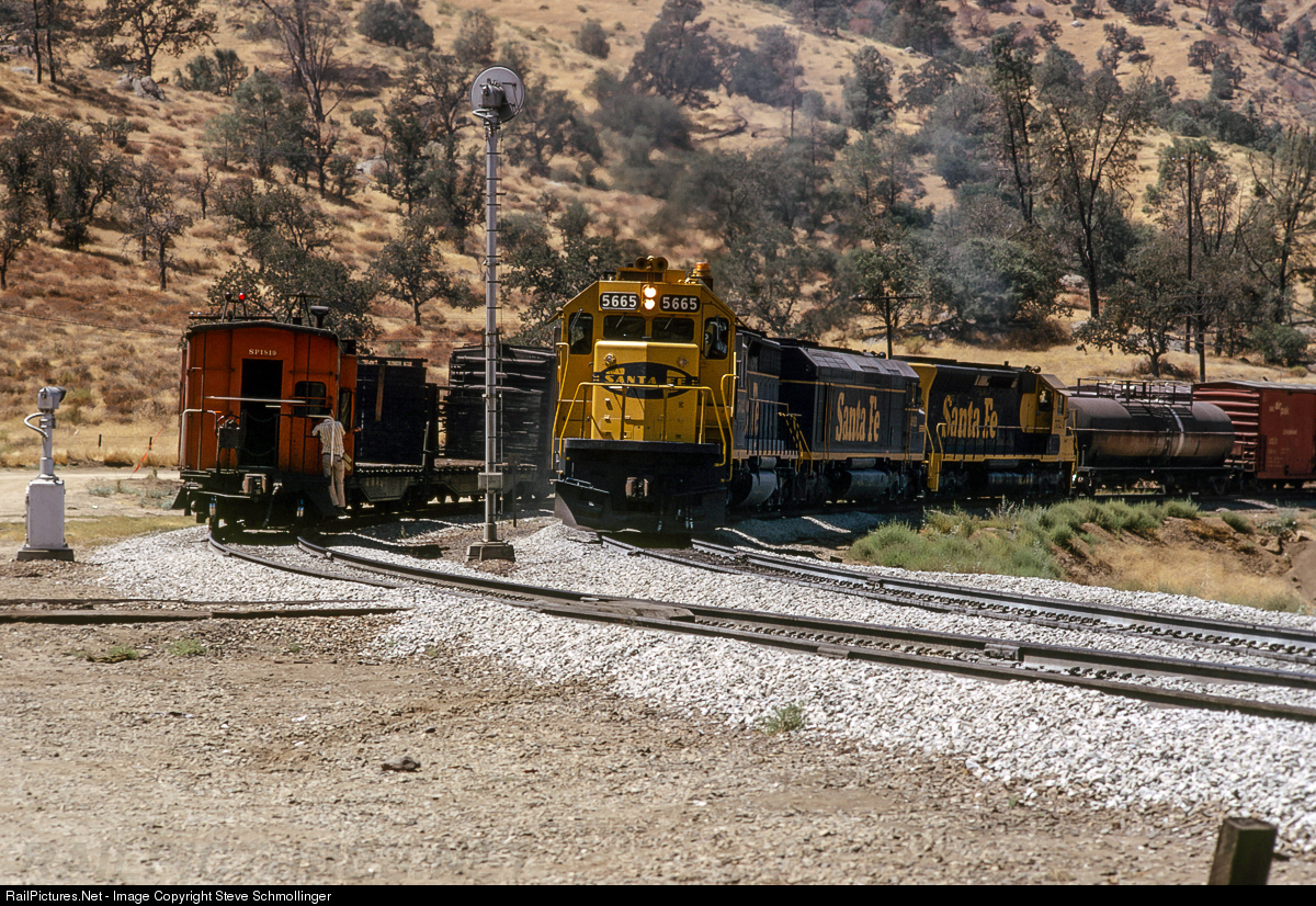 On a hot morning in August 1973, Santa Fe 5665 East meets an SP westbound in the hole at the Loop. The SP's conductor, which at this time rode in the caboose, will give the Santa Fe a roll-by. Both Santa Fe and SP continued to buy 20-cylinder EMD's even after the scare caused by bad welds in their prime movers' A-frames supporting the crankshaft (which EMD quickly corrected).