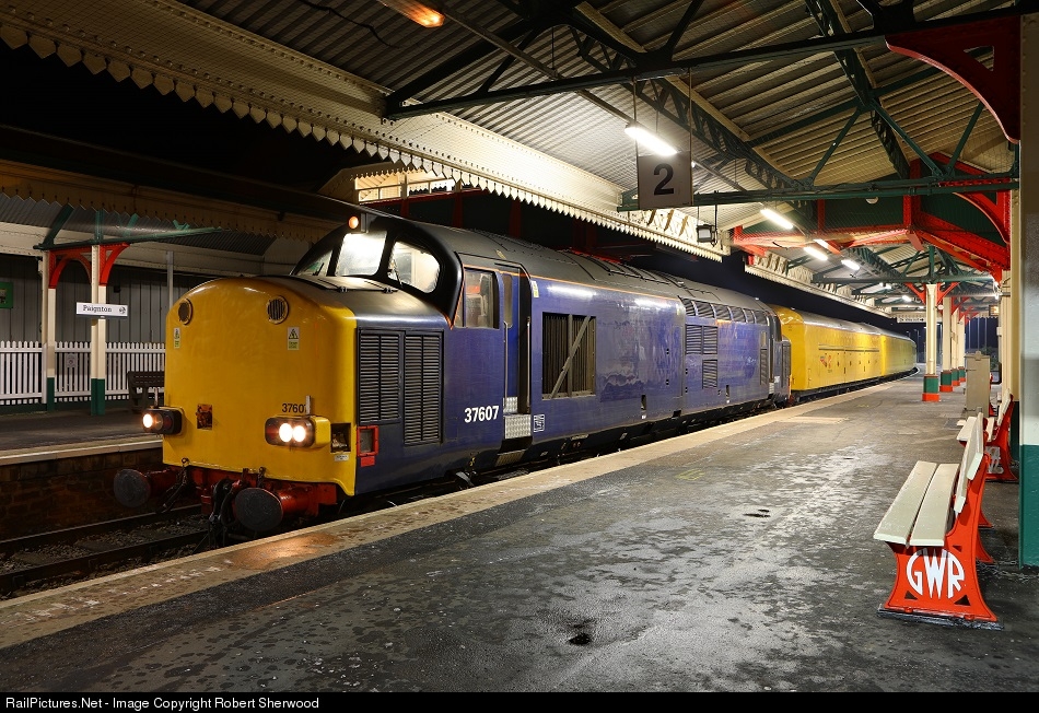 | 37607 stands at Paignton while working 3Q53 18:57 Bristol High Level Siding to Exeter Riverside at just past midnight on Thursday 1st March 2018 |