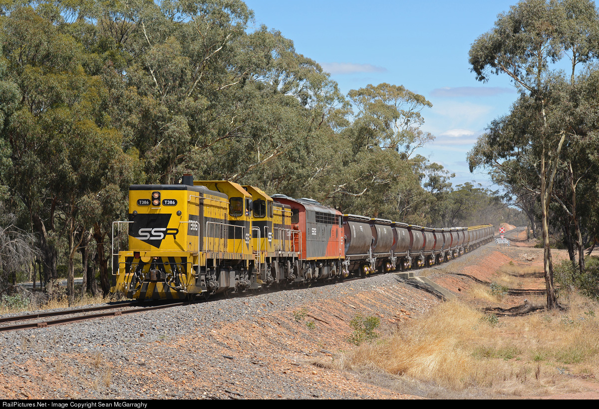 | T386, T381 & S302 unusually marshalled with the first two units cab to cab haul 9199 empty grain to Sea Lake. The train is running some 7 hours late due to a failure of a Qube grain service overnight blocking the Maryborough to Ballarat section for hours and the resulting congestion that built up after that, and is only passing through here at Arnold in the early afternoon. |