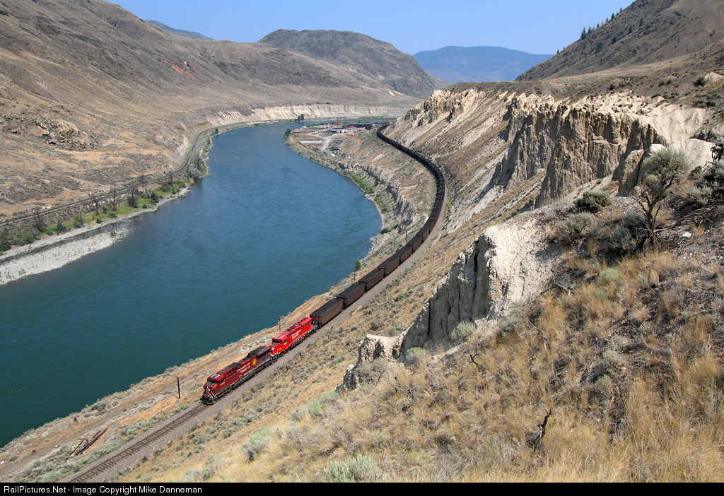 A westbound Canadian Pacific coal train passes then tie plant along the Thompson River just east of Ashcroft, British Columbia, on a hot July 15, 2014. Up front is a more unusual set of power (for unit coal trains) consisting of GE AC4400CW No. 8600 and EMD SD30C-ECO No. 5018.