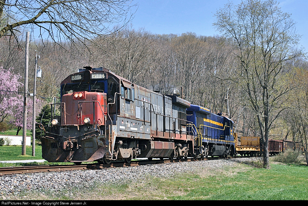 East Penn Railroad 5114, still in her original Espee bloody nose paint, leads a train of steel cars Northbound, heading for the steel mill in Coatesville
