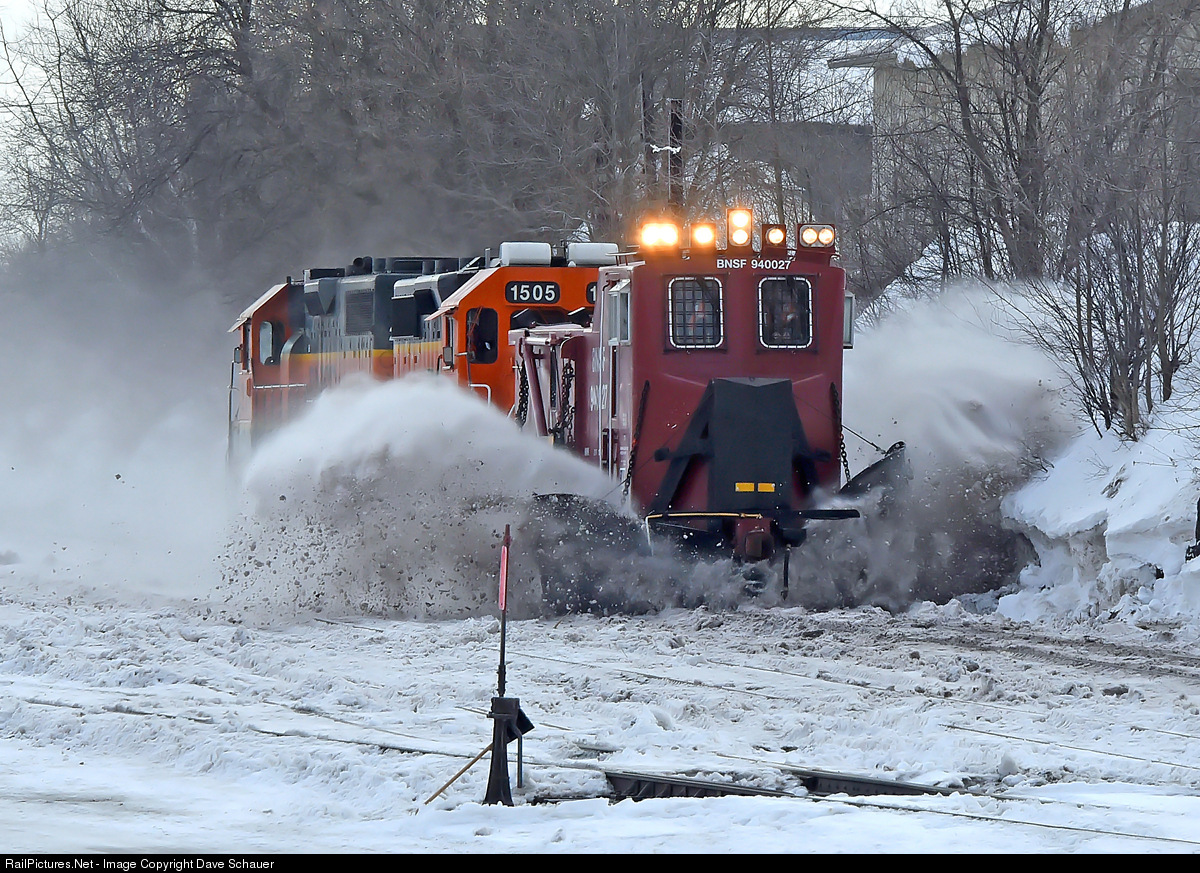 BNSF snow dozer 940027 clears the mainline through Cloquet.
