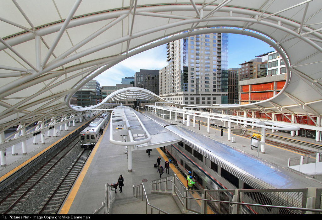 Train time at Denver Union Station A RTD A Line commuter train is about to depart for the airport, as Amtrak’s westbound California Zephyr makes its morning station stop at Denver, Colorado, on November 14, 2017. Passengers head for the Superliner-equipped train as two Amtrak workers clean windows so everyone has a clear view of the trip into the Rocky Mountains.
