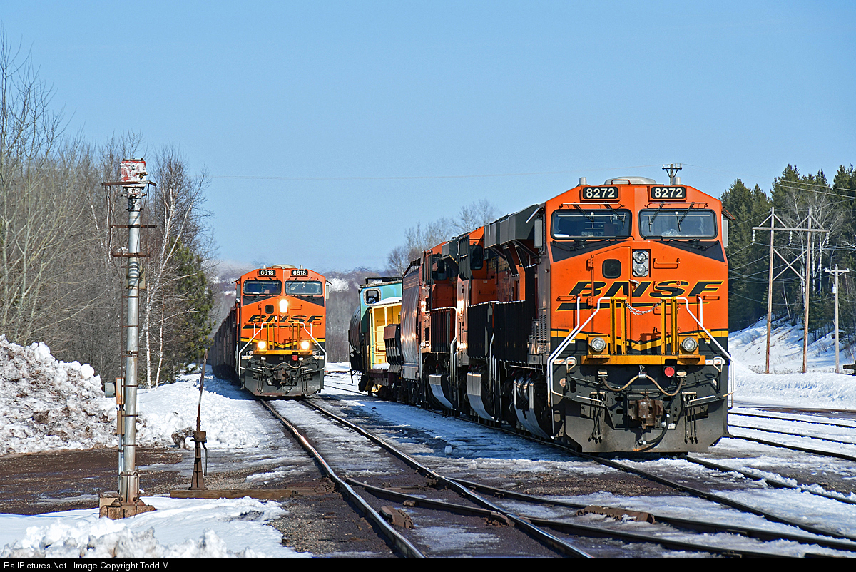 | BNSF 6618 leads a pellet train thru the yard at Kelly Lake after exiting Hibbing Taconite property and gets the favorable signals to begin the trip to the BNSF dock facility in Allouez, WI |
